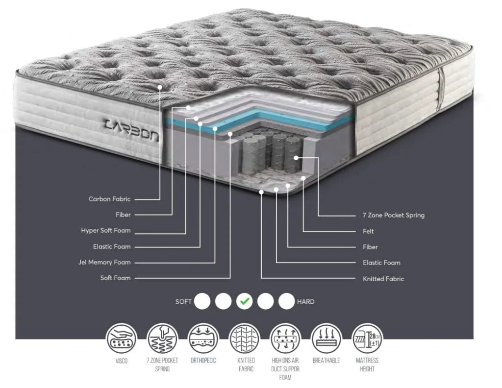 We offer you the comfort you need to wake up energized for the new day with gel memory sponge and carbon yarn technology that takes the shape of your body structure. Meet the Carbon mattress, which uses carbon yarn technology to regain the energy lost during the day, and wake up to the new day full of energy.
